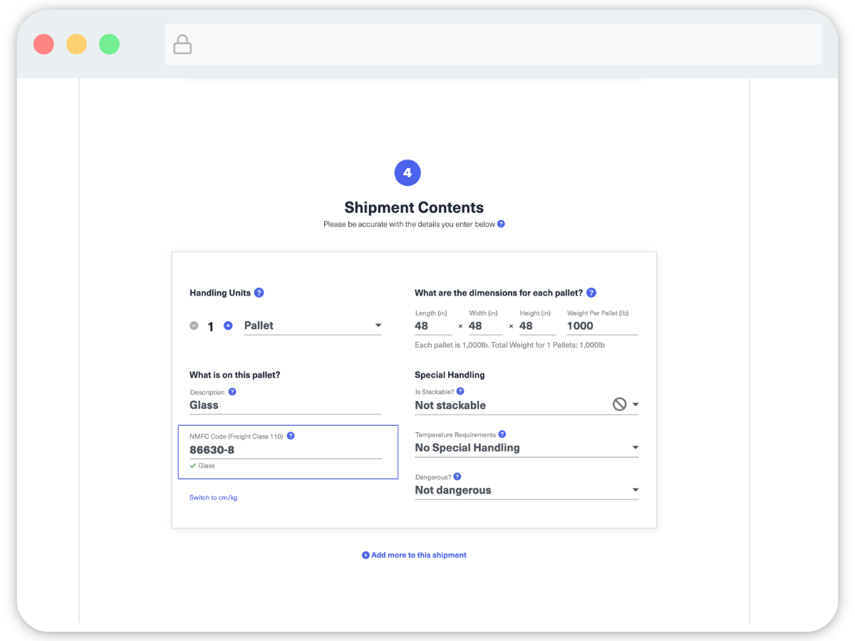 The FreightSimple team will help you figure out the NMFC code for a particular commodity and save it to your dashboard for future use. Typically, it's only a 5 minute conversation to figure this out, so don't hesitate to open a live chat or email support@freightsimple.com!
