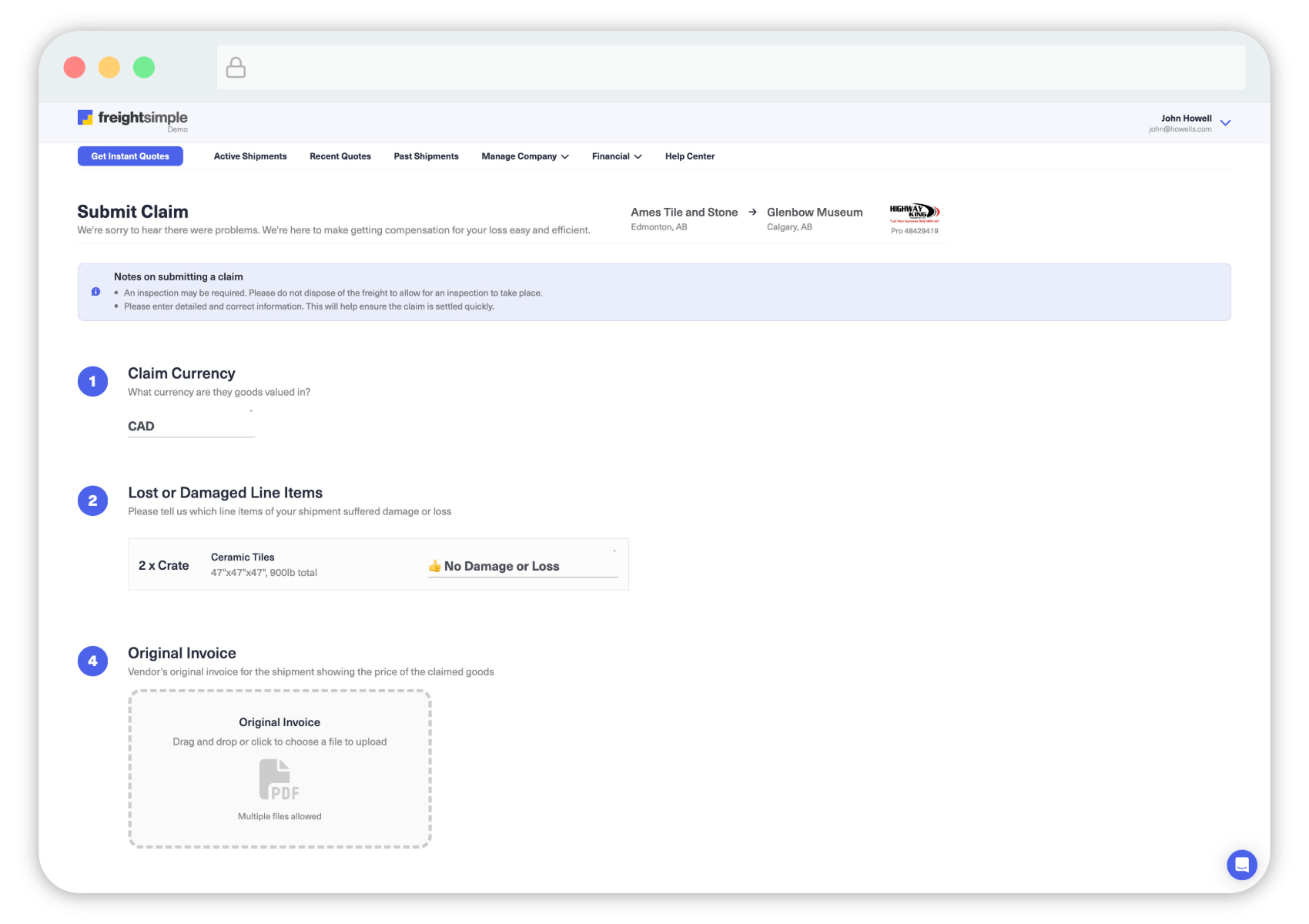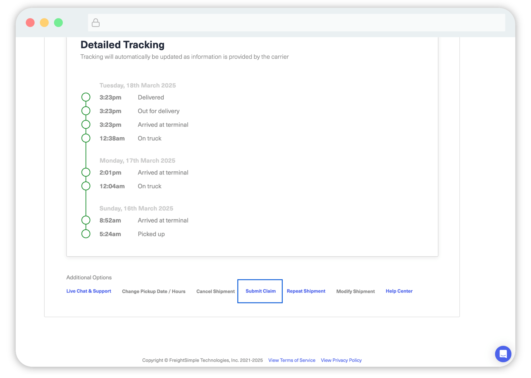 Once everything is filled out, hit Submit. You’ll receive a confirmation, and our team will follow up shortly.Wait for the Carrier’s Response: The carrier has 30 days to acknowledge the claim and 120 days to resolve it. During this period, they may request additional information. FreightSimple keeps in regular communication with the carrier to ensure the claim is being processed and moved forward in a reasonable timeframe.