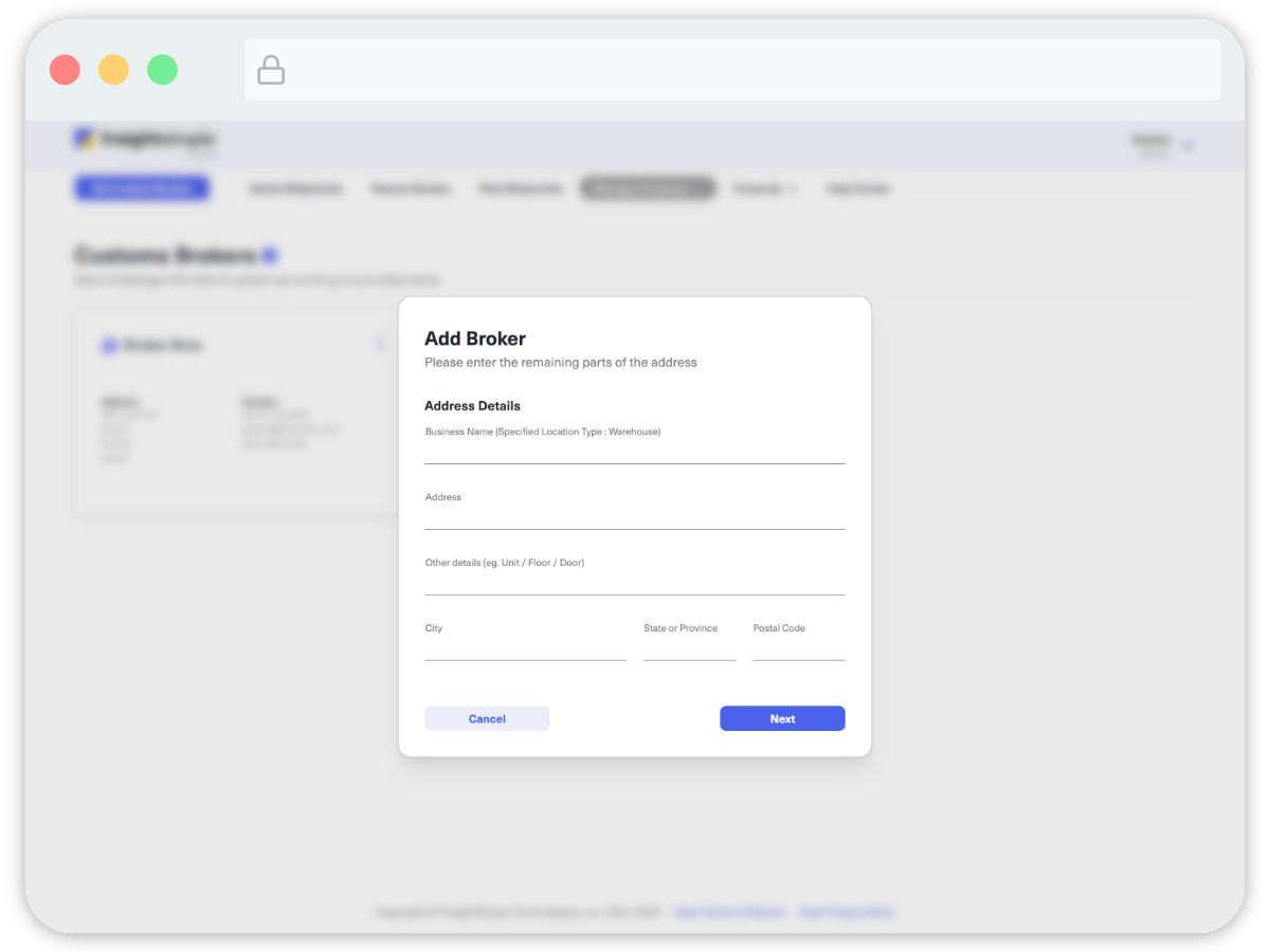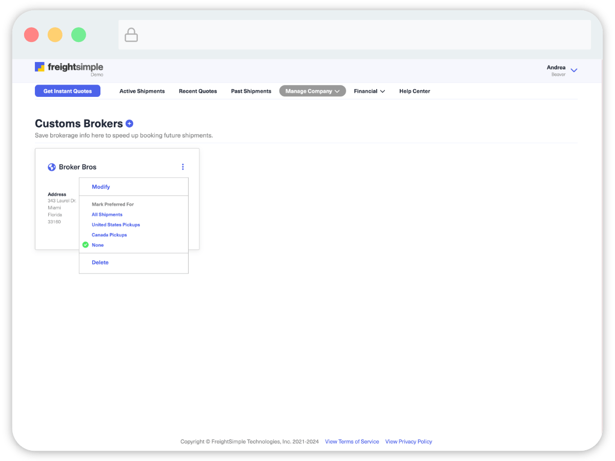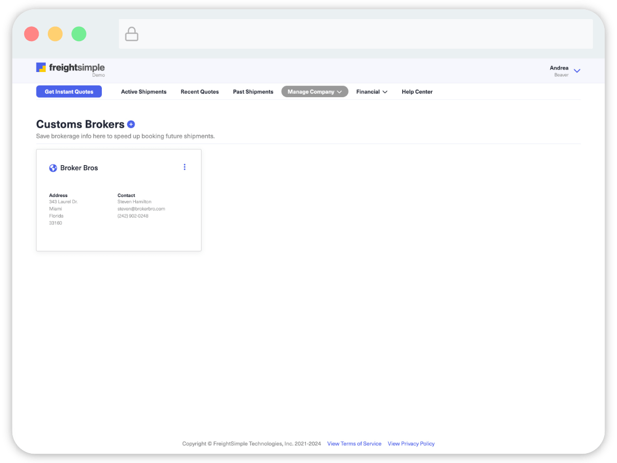 To save you time when booking shipments and help avoid mistakes, you can save the brokers you use in the "Customs Broker" section under the "Manage Company" tab.