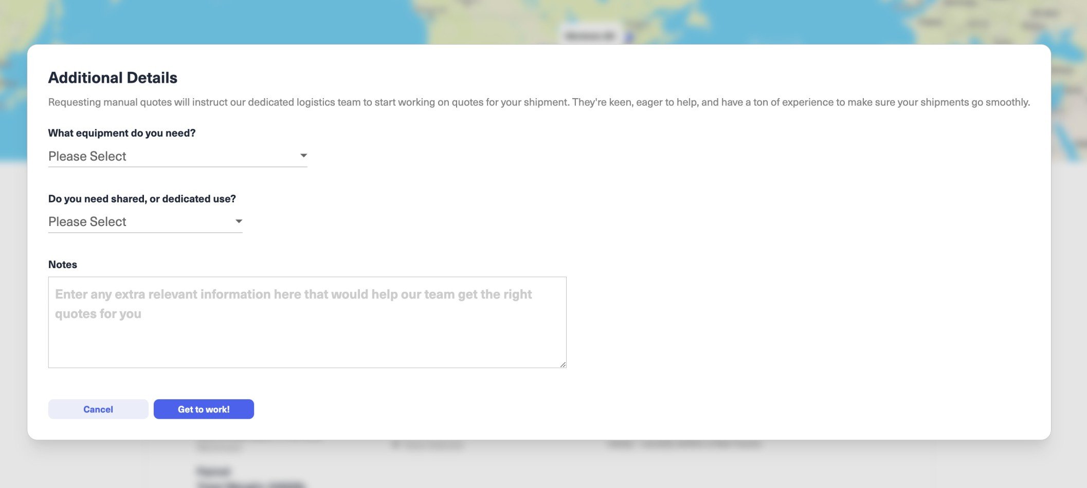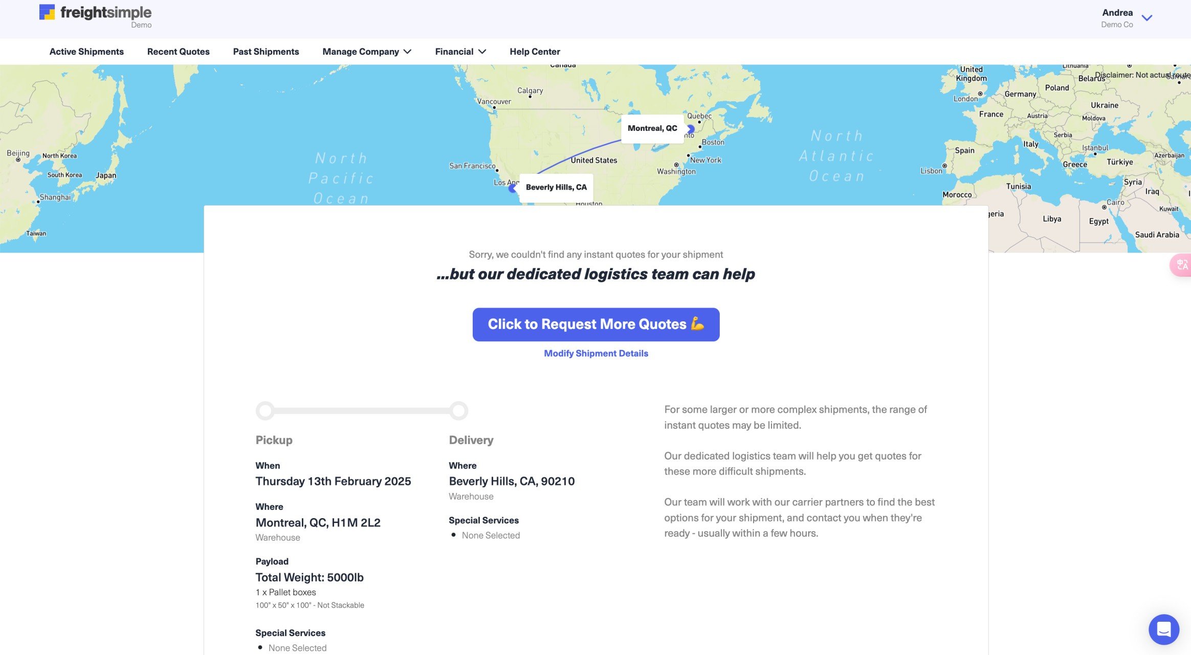 For larger or more complex shipments, instant quotes may be limited. In these situations, our dedicated logistics team steps in to assist. We’ll collaborate with our trusted carrier partners to source the best shipping options tailored to your needs.