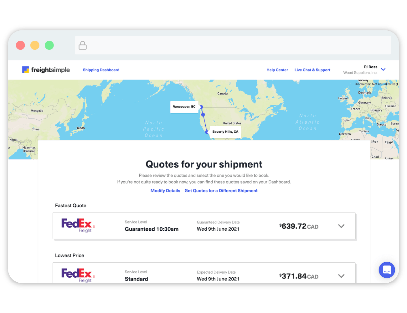 Once FreightSimple finishes finding quotes, you will see a list of the available carriers and options for your shipment.