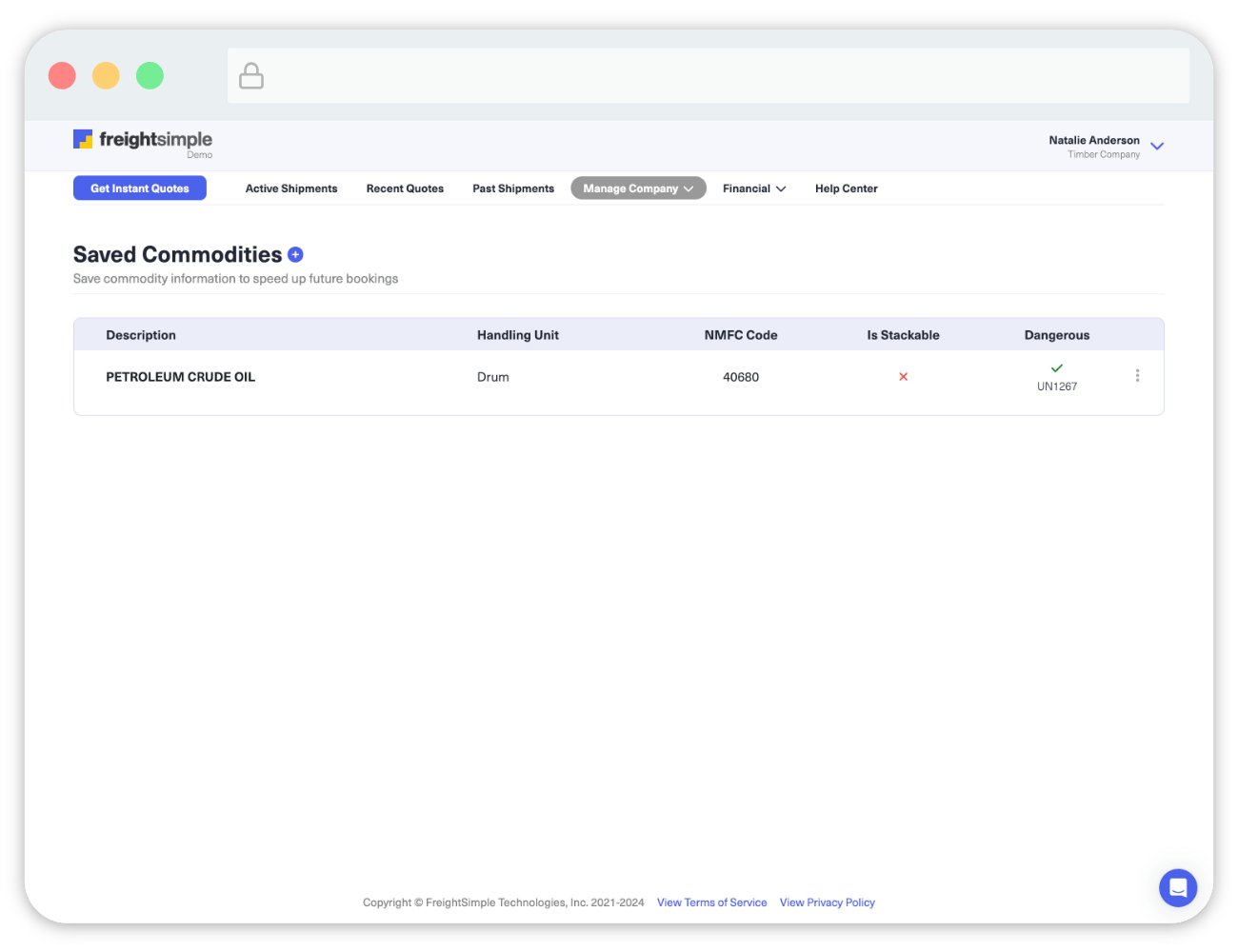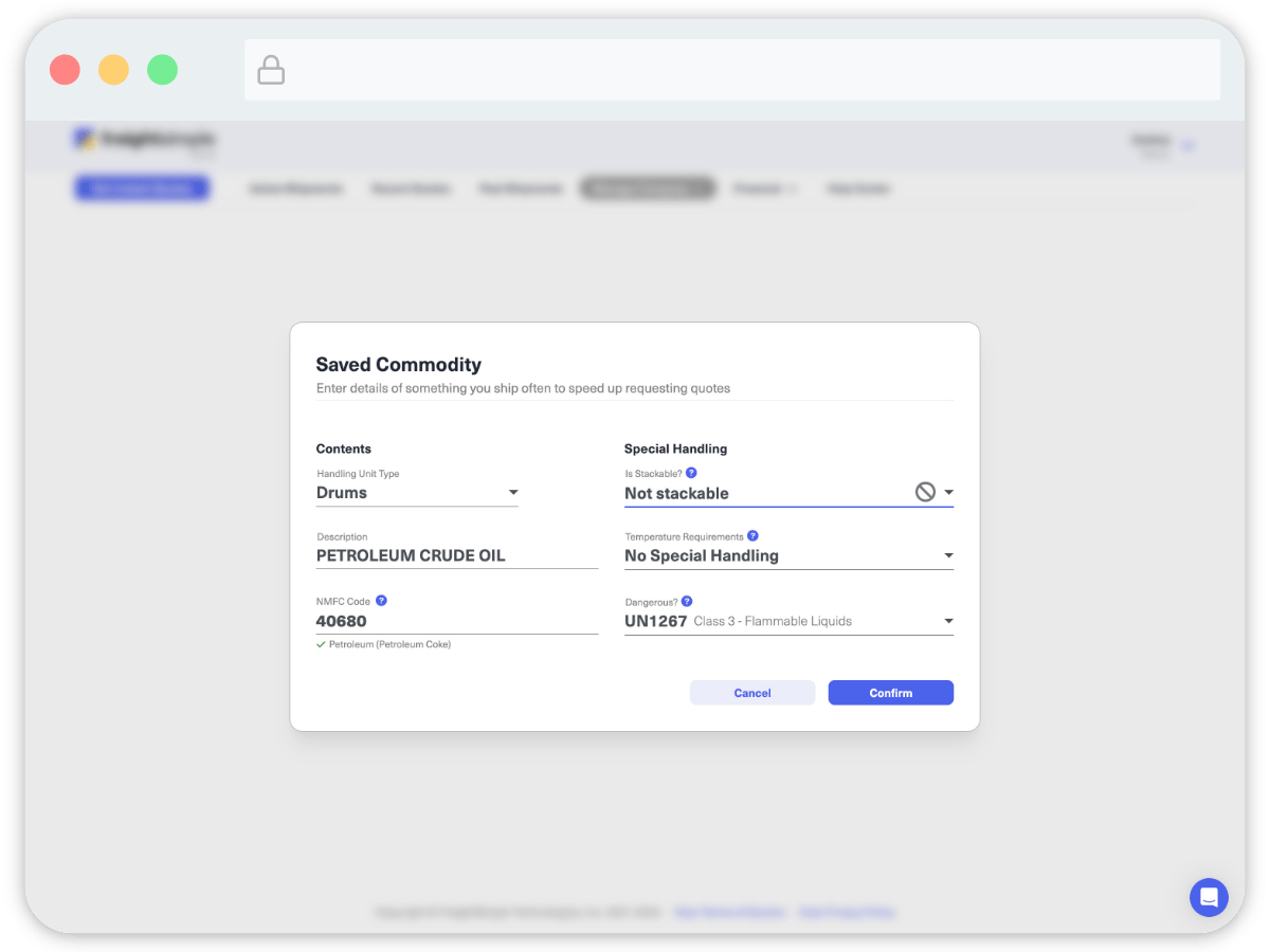 Saving commodities is particularly useful if you have NMFC codes, or dangerous goods information for your commodity. This saves you from remembering the numbers and details for each shipment. Setting up saved commodities also helps other members of your team book shipments in confidence, knowing all details will be correct.